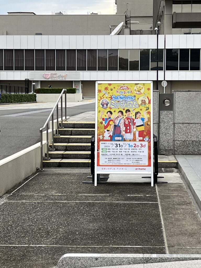 3歳とパパは公園の出店に向かい、13時15分頃に0歳とぱわママのみNHKホールに到着しました。20名ほど入口の前に人が並んでおり、公演看板前は2組ほどしかおらず、すぐに記念撮影を行うことができました。